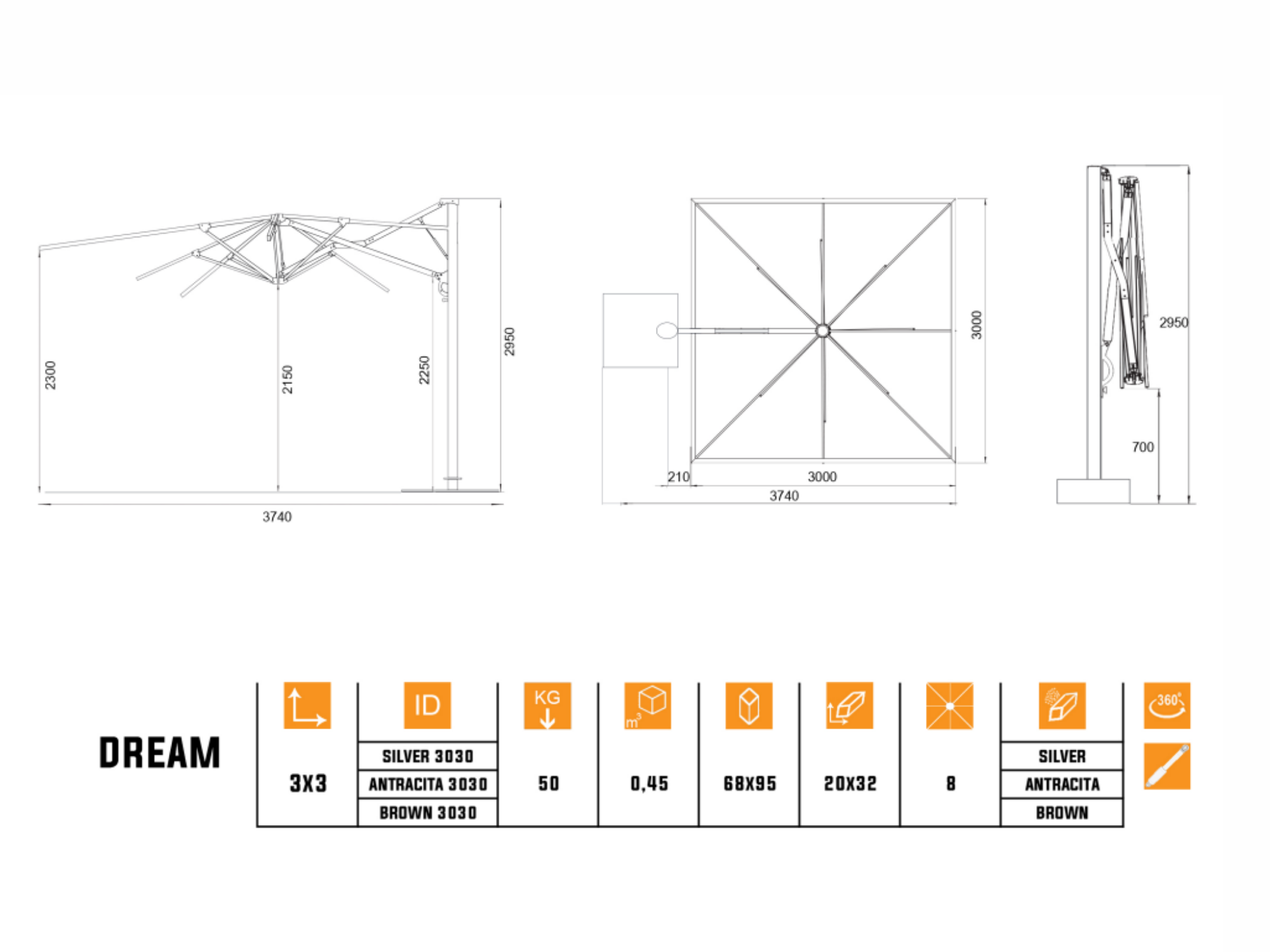 Yandan Direkli Klasik Kare Şemsiye 3*3